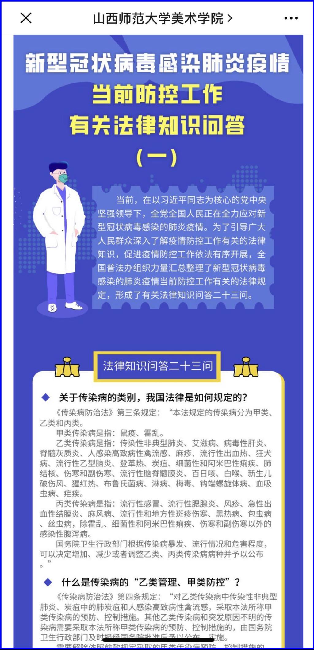 充分利用图解、H5等生动直观形式,抓好《新型冠状病毒感染肺炎疫情当前防控工作有关法律知识问答》、《防控新冠肺炎疫情涉及的法律问题》等疫情防控法制内容宣传教育工作,综合利用学习强国、学院公众号、教职工微信群、班级群、网课等途径,将问答内容推送到全院师生手中,引导全院师生系统学习疫情防控政策法规、安排部署和防护知识,明确疫情期间需履行的义务与责任,增强广大师生自我防范意识和依法防护能力,并号召大家通过权威机构和正规媒体了解疫情防治知识和疫情情况,正确理性看待疫情,不造谣、不信谣、不传谣。