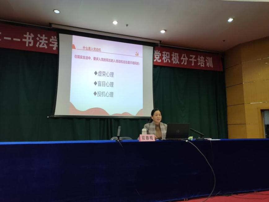 党委书记双春梅为积极分子作了题为《端正入党动机 争取早日入党》的第一次党课。从什么是正确的入党动机,端正入党动机的重要性,如何树立正确的入党动机,按照党员标准严格要求自己、争取早日入党四个方面展开论述。用生动鲜明的实例和轻松幽默的语言,并结合自身的经验体会,教育广大学员要端正入党动机,不断加强对党的认识,拥有坚定的政治立场,以实际行动积极向党组织靠拢,争取早日入党。