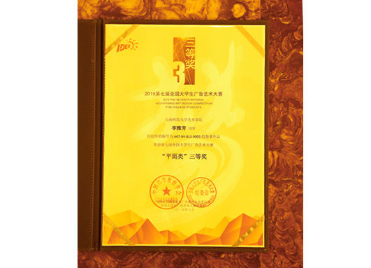 视觉传达专业12级学生李雅芳的作品《真c真柠檬,年轻c驱动》(指导教师吕金光)荣获平面广告类三等奖,14级研究生秦少梅的作品《透透气》(指导教师阴耀耀),14级研究生李秀媛的作品《洁婷标志设计》(指导教师宋雪梅)分别荣获平面广告类优秀奖。此外,14级研究生关梦盼作品《驱动工厂》和苗甜、姚玮作品《娃哈哈广告》(指导教师宋雪梅) 3名同学分别在山西分赛区中获三等奖。中国教育电视台、新华网等众多媒体对颁奖盛典进行了报道。