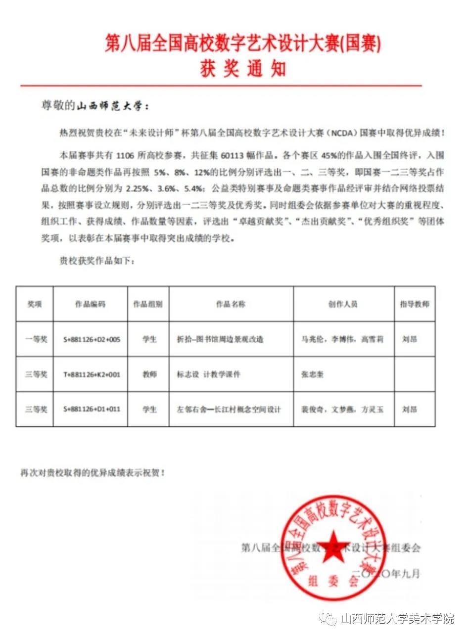 2020年11月14日,未来设计师“第八届艺术设计教育研讨会暨第八届全国高校数字艺术设计大赛(NCDA)颁奖典礼”在历史文化名城嘉兴市隆重举行。本届赛事共有1106所高校参赛,共征集60113幅作品。各个赛区45%的作品入围全国终评,入围国赛的非命题类作品再按照5%、8%、12%的比例分别评选出一、二、三等奖,即国赛一二三等奖占作品总数的比例分别为2.25%、3.6%、5.4%。
